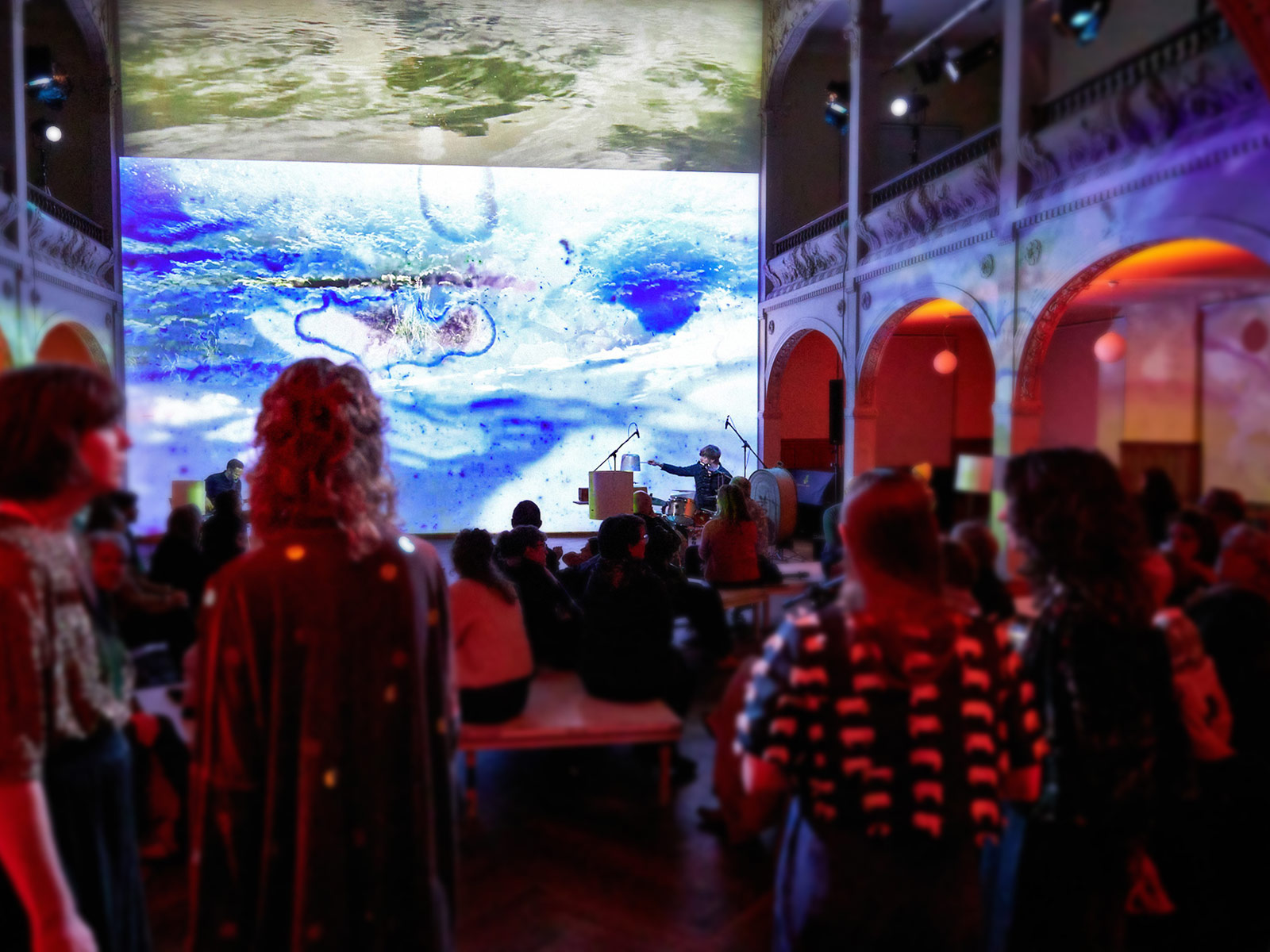 Der Logensaal wird während der Performance zum vibrierenden Flussbett, auf dem sich wissenschaftliche Erkenntnisse über die Wahrnehmung von Fischen und künstlerische Fiktion miteinander verweben. Das Publikum begegnet den Wissenschaftler*innen und Künstler*innen aus Deutschland und Polen in offenen Talkrunden – die Künstlerin Claudia van Hasselt hat dafür das Diskursformat senSONICtalk© entwickelt. Die interaktiven Gespräche werden künstlerisch gestaltet und wechseln sich als eigene Kunstform ab mit Sound Art, visueller Kunst, freier Improvisation und den Kompositionen von Wojtek Blecharz.