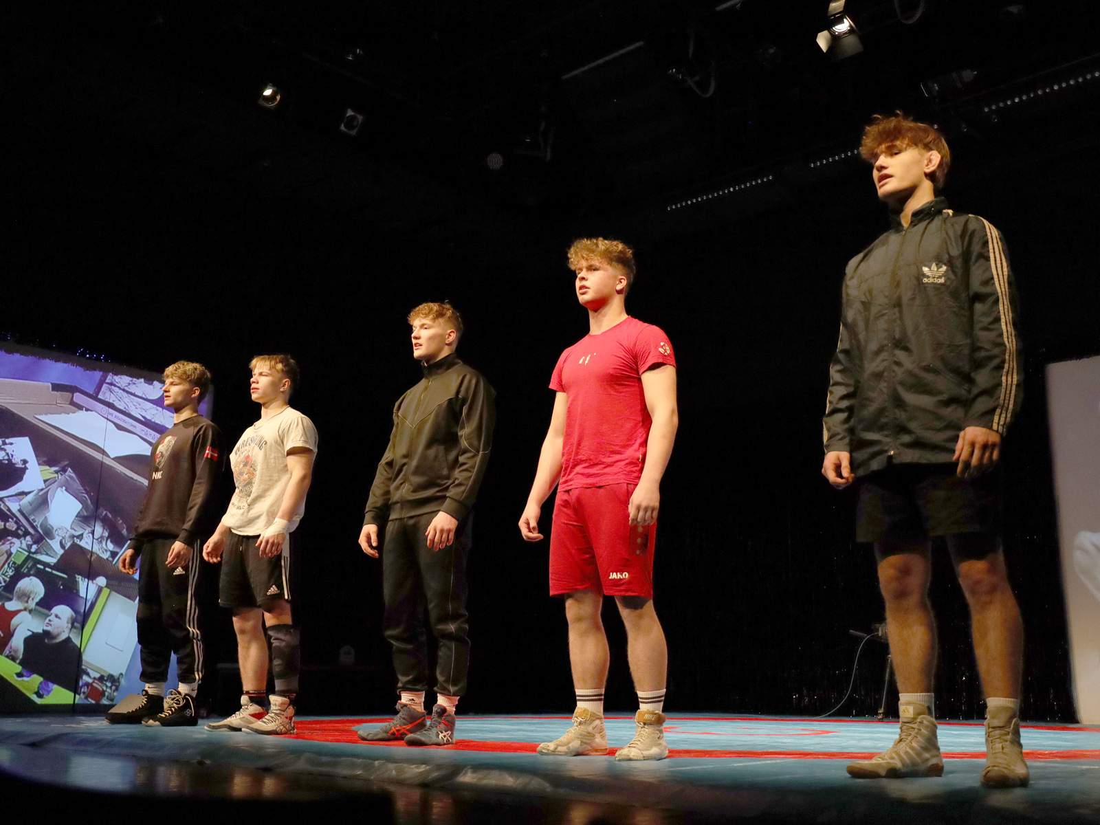 „Sekundenglück“ feierte am 14. Februar auf der Studiobühne des Frankfurter Kleist Forums Premiere. In der emotionalen Kampfsport-Performance setzen sich fünf junge Ringer mit ihrer Biografie als Hochleistungssportler auseinander. Sie erzählen von Erfolgsmomenten und Niederlagen, von der stupiden Eintönigkeit des Trainingsalltags, der Angst nicht genug zu sein und dem Druck, die Willensstärke trotz allem nicht zu verlieren. Für das Projekt arbeiten Regisseur Hannes Langer und sein Team eng mit der Frankfurter Sportschule und dem Ringsportverein Hansa 90 zusammen.