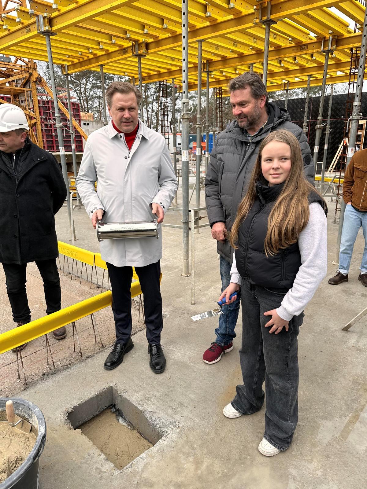 A special moment at the laying of the foundation stone was the personal letters read out by pupils from class 7a of the neighboring secondary school. For example, 13-year-old Moritz from Spreenhagen spoke about his wish for a crisis-free future and then placed his letter in a metal time capsule. District Administrator Frank Steffen also filled the capsule with a copy of the Märkische Oderzeitung newspaper as a contemporary document, before he walled the capsule into the foundations of the shell of the "Spree Primary School" in a symbolic act together with the pupils.
